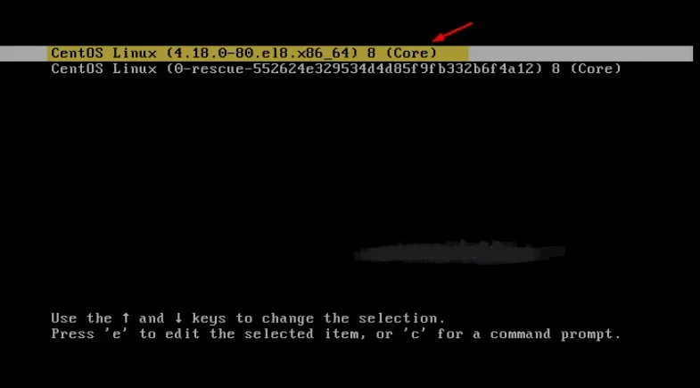 Langkah 1 : Nyalakan ulang Server CentOS 8 atau RHEL 8 dan buka layar grub boot loader dengan menghentikan boot otomatis dan pilih baris pertama yang menyertakan kernel (Jika Sobat memiliki beberapa baris kernel, pilih yang sesuai dengan lingkungan Sobat). Di bawah ini adalah layar boot loader CentOS 8