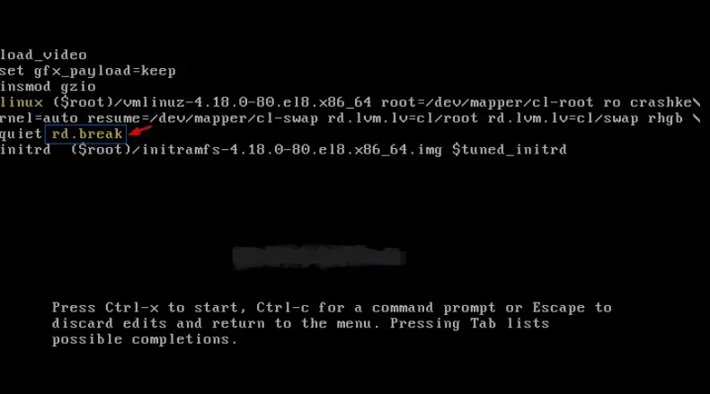 Langkah 2 : Tekan 'e' untuk masuk ke mode edit dan kemudian pergi ke akhir baris yang dimulai dengan kata 'linux', ketik kata kunci "rd.break"