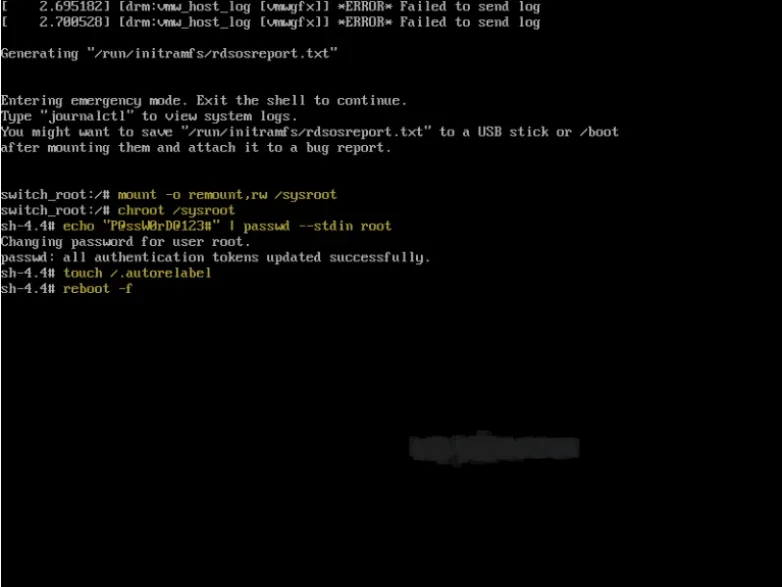 Langkah 3 : Pasang kembali /sysroot dalam mode read-write (rw) dan Jalankan perintah berikut untuk me-mount sistem file sysroot di rw :