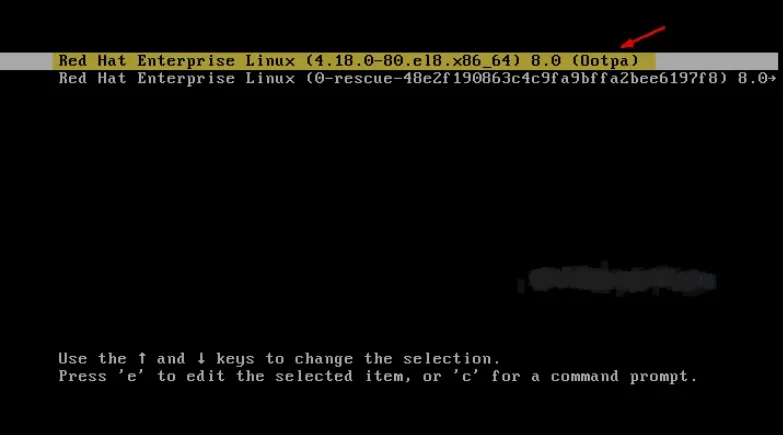 Langkah ke-1 : Reboot Sistem CentOS 8 / RHEL 8 Sobat dan hentikan boot otomatis dengan memasukkan tombol panah atas dan bawah maka kita akan mendapatkan layar grub berikut :