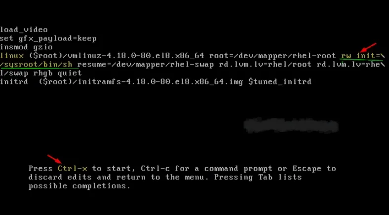 2.Mengganti kata 'ro' dengan "rw init=/sysroot/bin/sh"