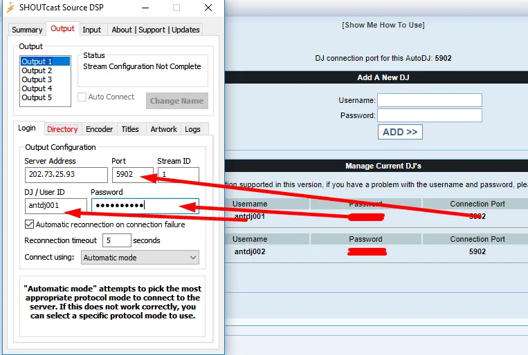 Klik Tab Output lalu dibawahnya klik tab Login. Isikan server IP yang ada di Home menu panel WHMSonic. untuk DJ/User ID, Password dan Port disesuaikan dengan user DJ yang sudah anda buat.