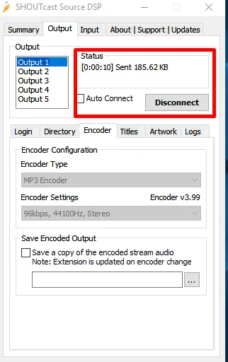Jalankan file musik di winampnya kemudian klik tombol Connect. Jika koneksinya berhasil maka status akan menampilkan status "sent" dan tombol Connect akan berubah menjadi Disconnect.