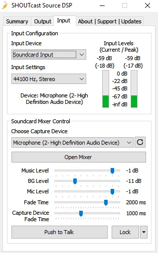 Selanjutnya jika anda ingin live streaming dari microphone contohnya anda ingin interaktif memberikan pembicaraan tertentu, anda hanya perlu merubah settingan di Shoutcast Source DSP yang tadi. Di tab menu Input untuk Input Device anda pilih Soundcard Input. Microphone-nya harus terhubung dengan laptop/PC anda. Untuk settingan bitrate dan sebagainya silahkan disesuaikan.