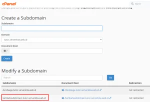 • Lalu Klik Create & apabila berhasil maka akan menampilkan keterangan subdomain sebagai contoh berikut.