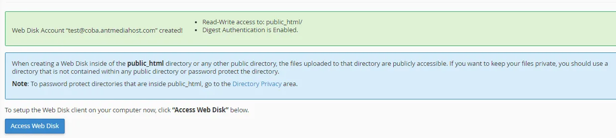 5. Klik Create, setelah itu klik Access Web Disk.