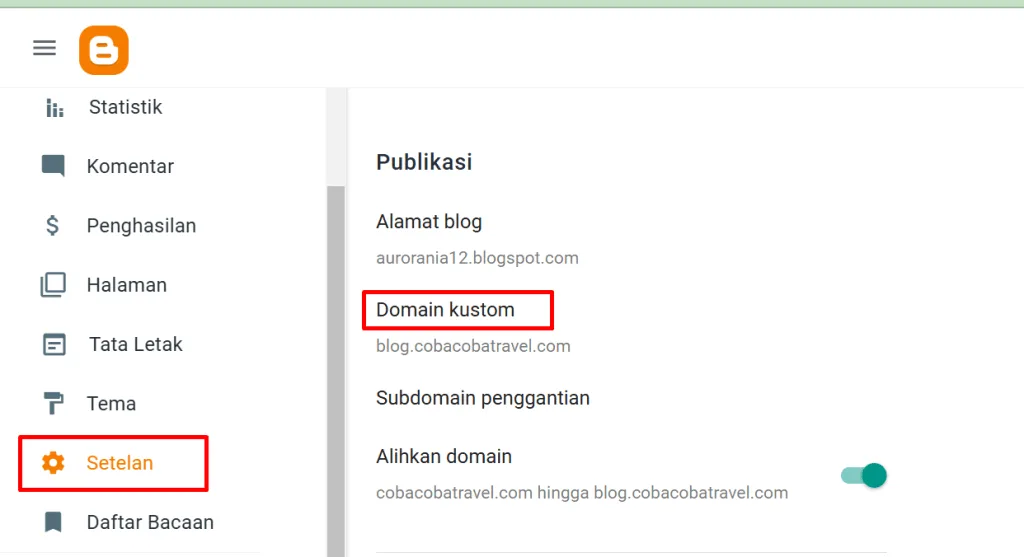 pilih menu “Setelan/Setting”, setelah itu temukan bagian Publikasi lalu klik bagian “Domain Kustom”