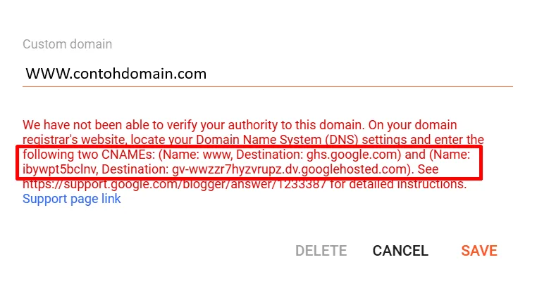 b. CNAME kedua berisi tulisan random yang akan berbeda untuk setiap blogspotmu. Contoh CNAME record yang nanti perlu kamu tambahkan sesuai dengan gambar yang dikotaki merah ya, Sob!