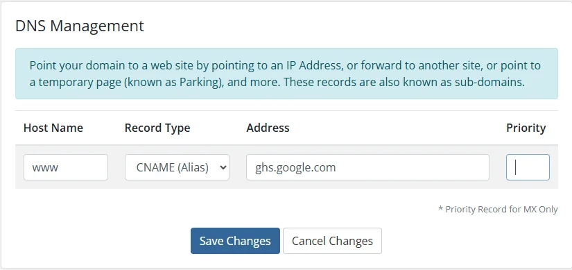 a. CNAME pertama berisi Name diisi dengan “www” dan Destination “ghs.google.com”.