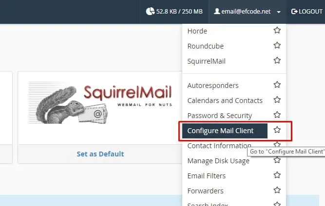 Di bagian pojok kanan atas disamping "Logout", klik dropdown-nya dan pilih "Configure Mail Client".
