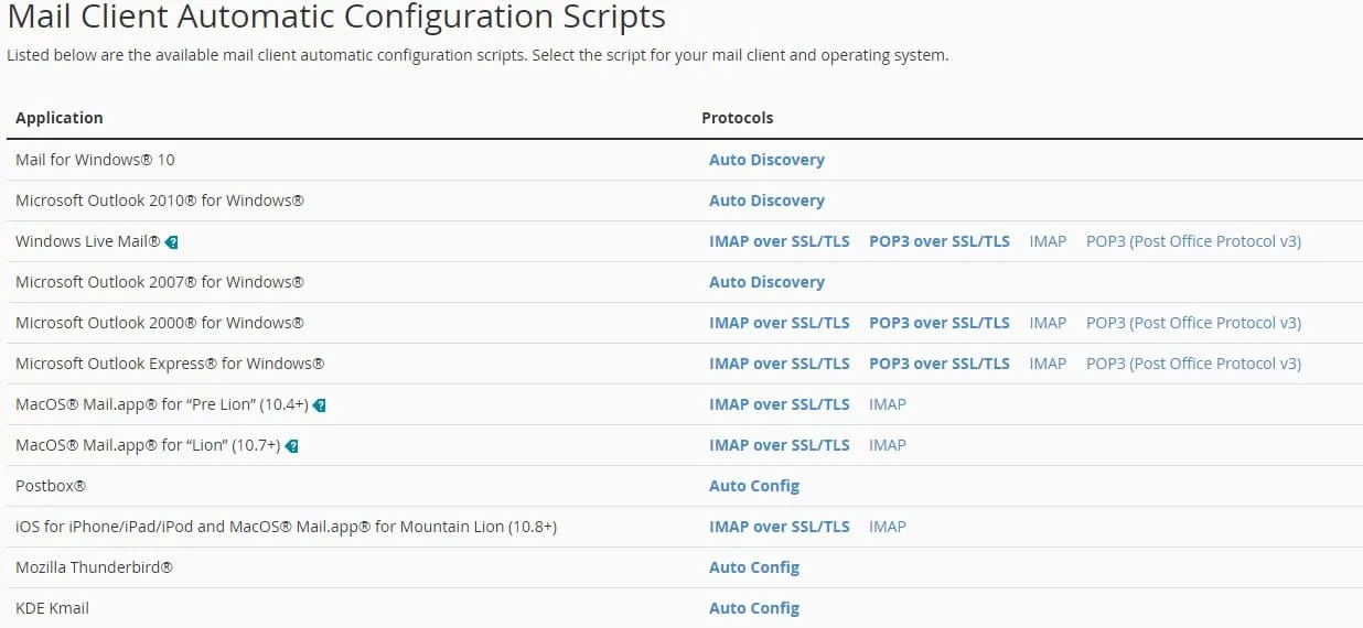 Akan ditampilkan informasi detail untuk konfigurasi email untuk aplikasi/software mail client. Disana akan terlihat juga beberapa versi aplikasi mail client yang bisa menggunakan Automatic Configuration.