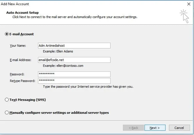 Tampilan berikutnya adalah untuk memilih antara Automatic Configuration dan Manual Configuration. Pilih E-mail Account dan isikan informasinya. Jika sudah, klik Next