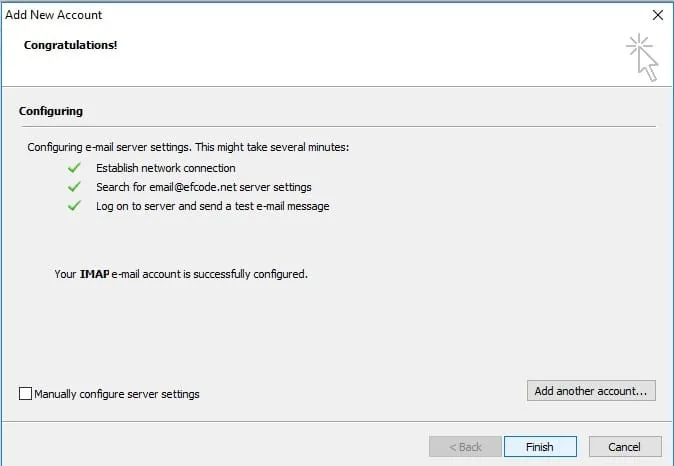 Jika aplikasi mail client kita memang support Automatic Configuration maka akan muncul informasi bahwa konfigurasi berhasil dan biasanya otomatis menggunakan protokol IMAP. Klik Finish dan langkah Automatic Configuration cukup sampai disini. Email anda sudah bisa anda gunakan.