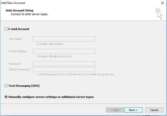 Pada bagian Add New Account pilih "Manually Configure ... ". Klik Next.