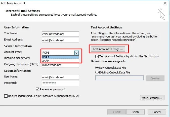 Setelah terisi dengan benar, jika anda menggunakan Non-SSL setting langsung saja klik Test Account Settings. Jika kedua test dinyatakan Completed dan tidak ada error itu berarti konfigurasi email anda telah berhasil. Klik Finish untuk menyelesaikannya.