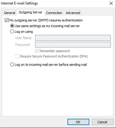 Jika anda menggunakan SSL setting maka klik More Settings. Di bagian Outgoing Server ceklist My outgoing server (SMTP) requires authentication dan pilih pilihan yang pertama.