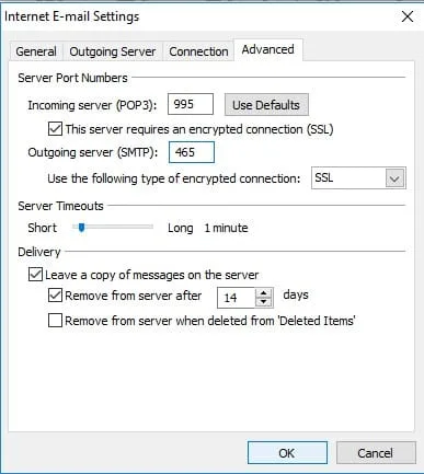 Selanjutnya klik tab Advanced. Ceklist pilihan SSl di incoming dan outgoing (SMTP). Tuliskan port sesuai dengan informasi di webmail. Jika anda menggunakan protokol POP3 maka dibagian bawah bisa ditentukan mengenai status email di server. Jika sudah selesai, Klik OK.