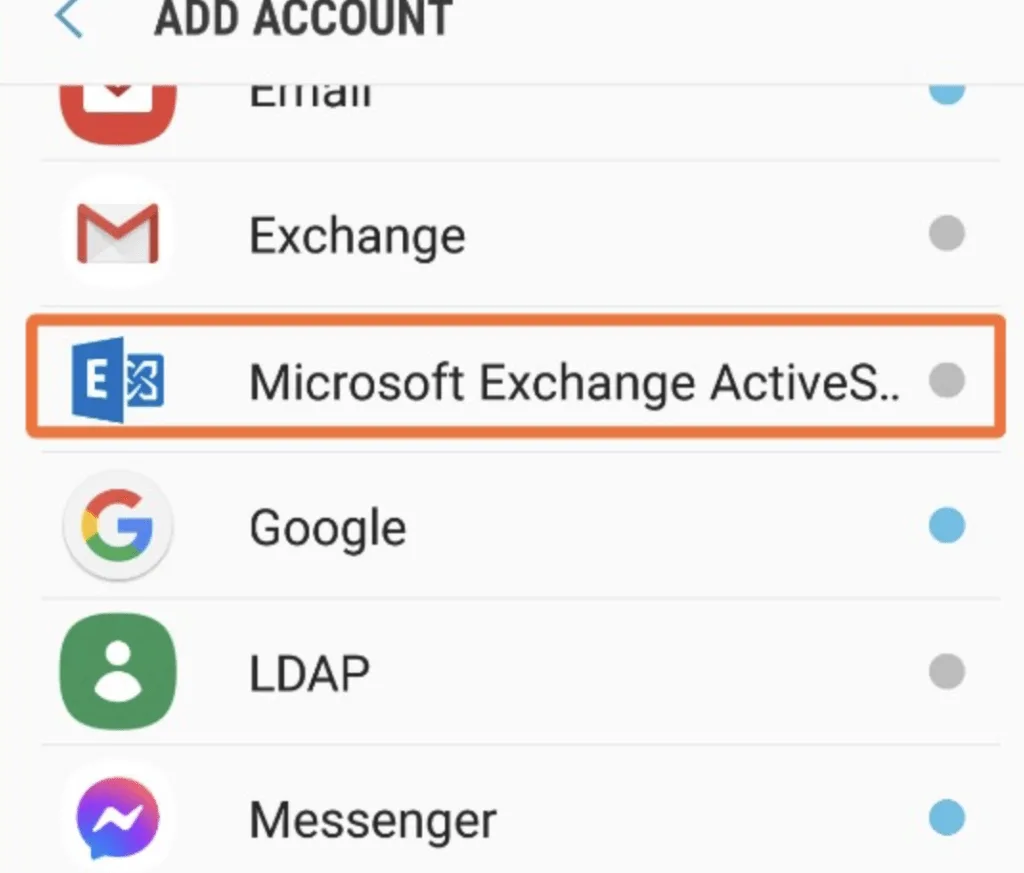 3. Pada tampilan add account, pilih “Microsoft Exchange ActiveSync”