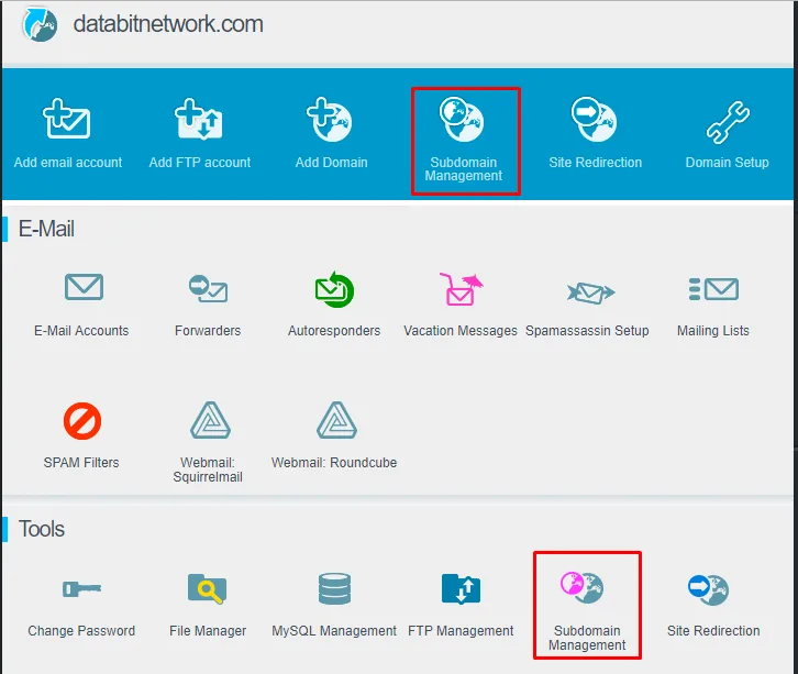 Pilih menu Subdomain Management yang berada di bagian Tools atau di Quick Menu.