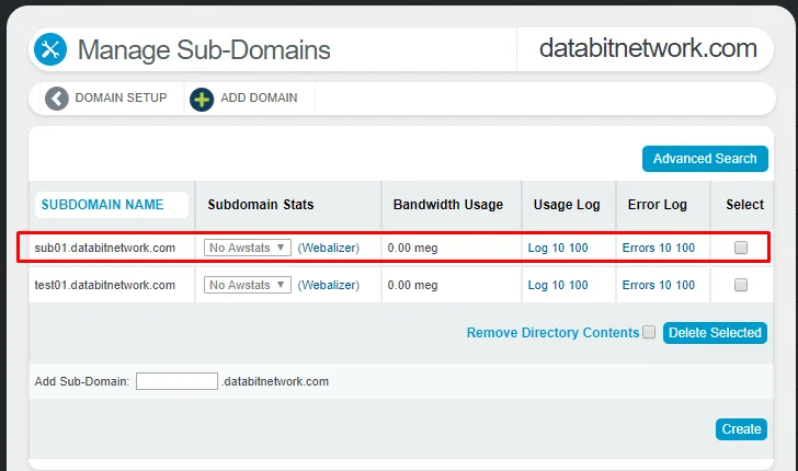 Silahkan diisi textbox Add Sub-Domain di bagian bawah lalu klik Create.