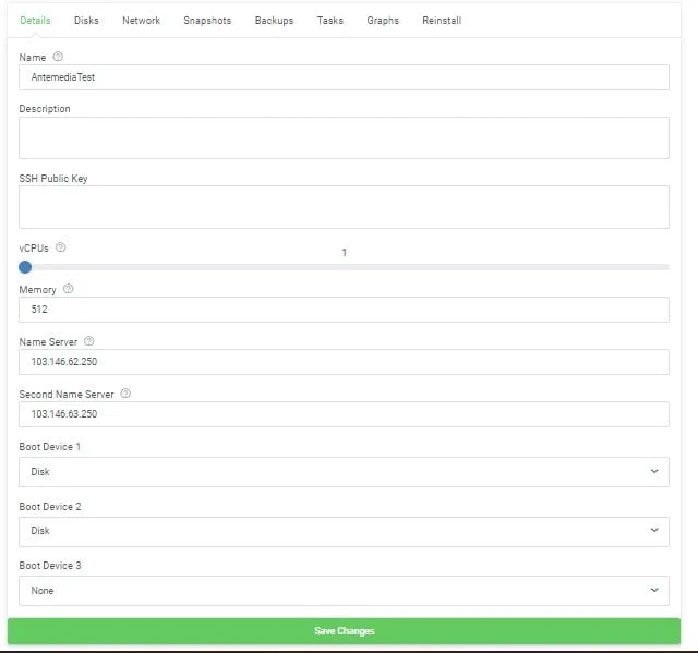Seperti Gambar yang terlampir, menu details ini menunjukan spesifikasi VM yang telah dibuat, dan dapat melakukan beberapa perubahan seperti vCPUs, Memory, name server dll.