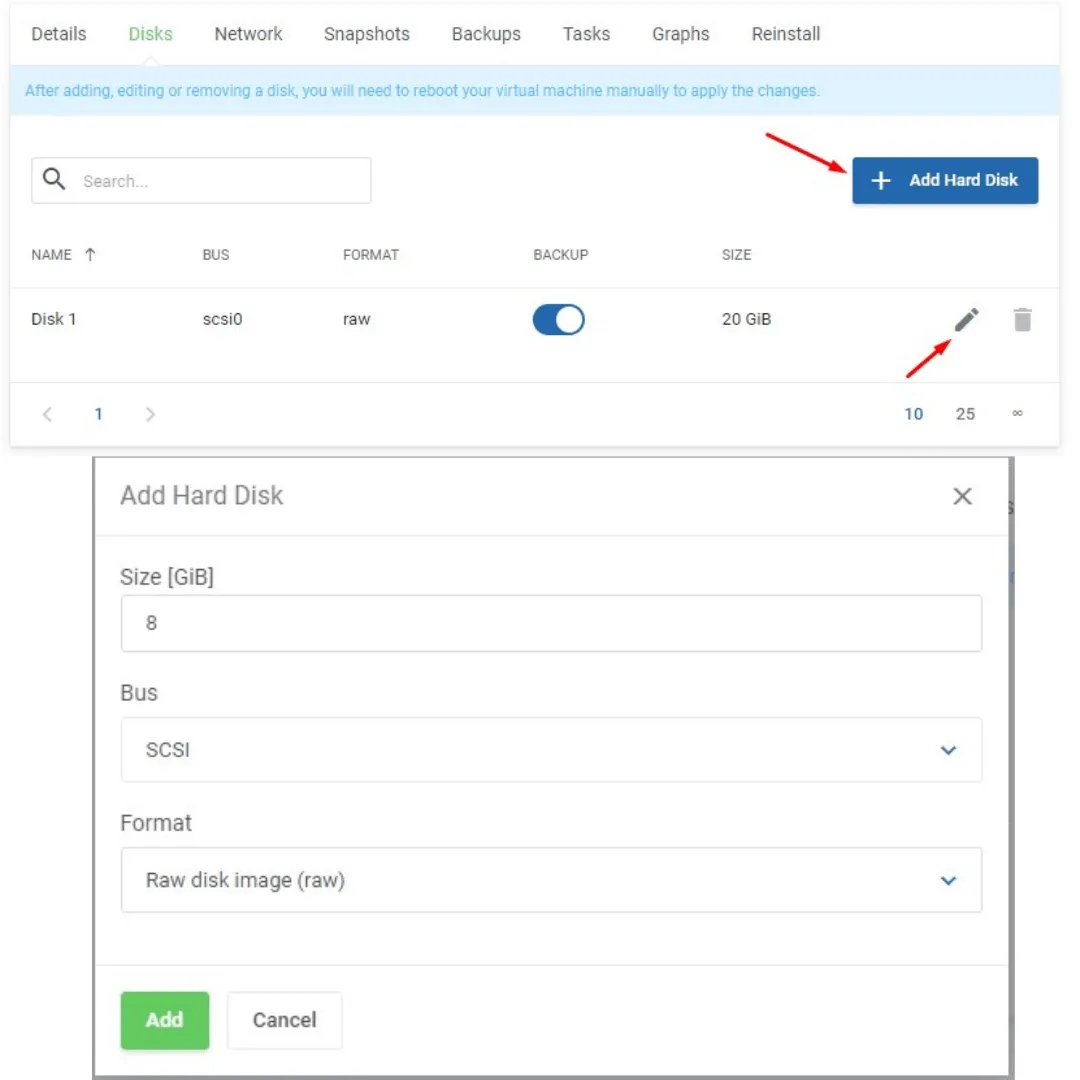 Pada menu ini anda bisa menaikan jumlah disk yang sudah ada, atau anda bisa menambahkan sebagai Hard Disk baru sesuai dengan kebutuhan untuk VM anda, dengan catatan VM harus dalam keadaan stop. Caranya yaitu : Klick Add Hard Disk -> Isi size yang dibutuhkan -> Pilih SCSI pada BUS -> Pilih raw disk image (raw) pada format -> Klick Add -> Selesai.