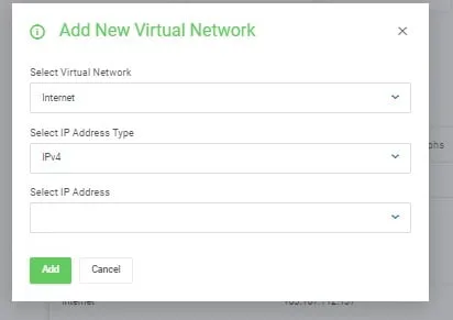 Menu ini berfungsi untuk menambahkan IP virtual network yang sudah dibuat pada menu product details -> Create New Virtual Network. Atau juga bisa menyewa layanan Dedicated IP dari kami.