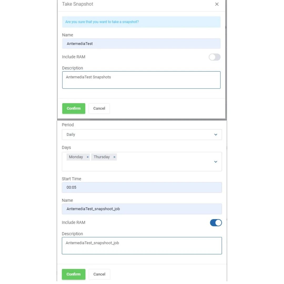 Untuk membuat jobs bisa dengan cara : Klick New Job -> Pilih Daily -> Tentukan hari apa saja yang dibutuhkan -> Tentukan waktu start untuk membuat snapshotnya -> Isi nama, enable/disable include RAM, isi deskripsinya -> Klick confirm -> Selesai