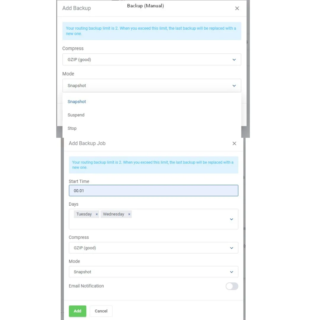 Untuk membuat backup jobs bisa dengan cara : Klick Add Backup Job -> Sesuaikan start time sesuai keinginan -> Pilih hari-hari untuk membuat backup sesuai keinginan -> Pilih GZIP pada Compress -> Sesuaikan mode yang diinginkan -> enable/disable email notification -> Klick Add -> Selesai