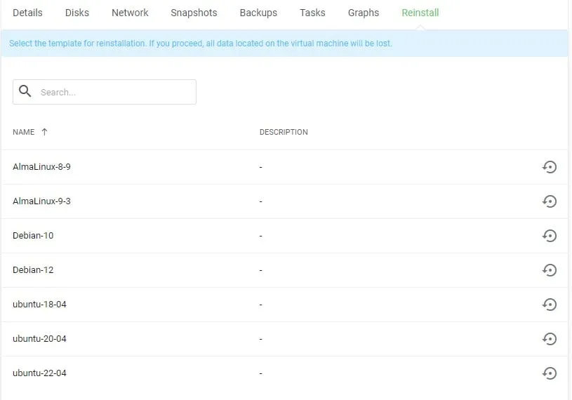 Menu ini berfungsi untuk melakukan installasi ulang OS pada VM yang telah dibuat, kami menyediakan berbagai macam OS seperti yang terlampir pada gambar.