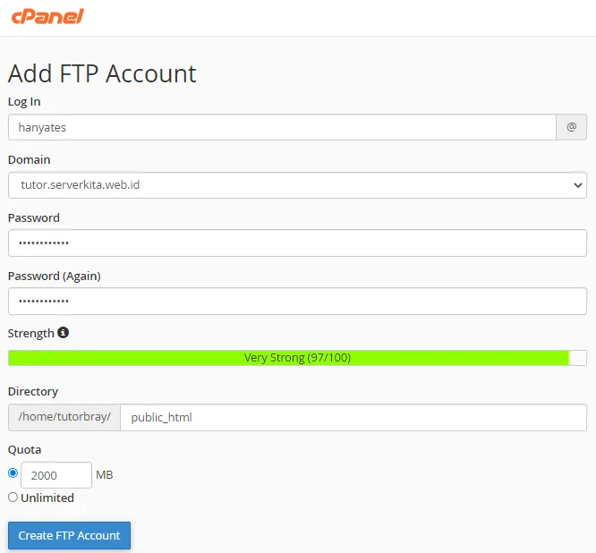 Isikan beberapa kolom yang telah tersedia, lalu klik Create FTP Account.