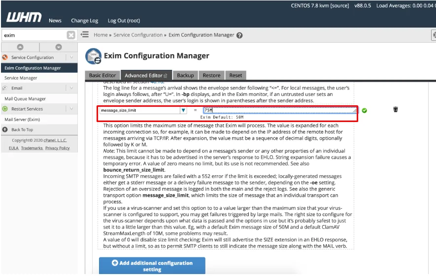 Masih di WHM, buka Exim Configuration Manager → Advanced Editor, lalu atur message_size_limit sesuai kebutuhan.