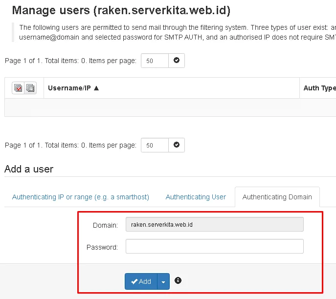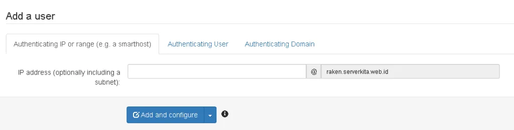 Authenticating IP untuk mengizinkan semua email keluar dari IP tertentu (dalam kasus ini ip server cpanel), Authenticating user digunakan untuk mengatur SMTP AUTH per-user secara spesifik, sementara Authenticating Domain digunakan digunakan untuk relay SMTP dari satu domain spesifik.