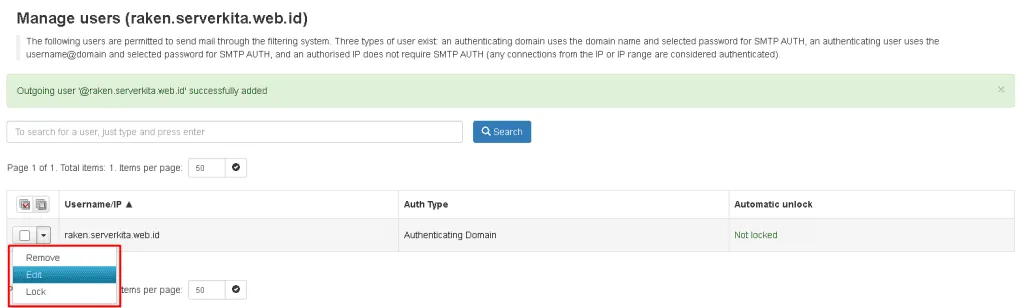 3. Setup authentikasi pengiriman untuk user di menu : Outgoing > Manage Users. disini ada 3 authentikasi :