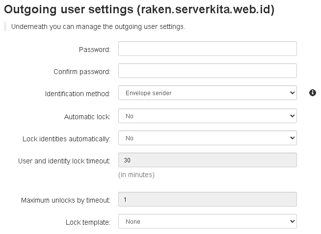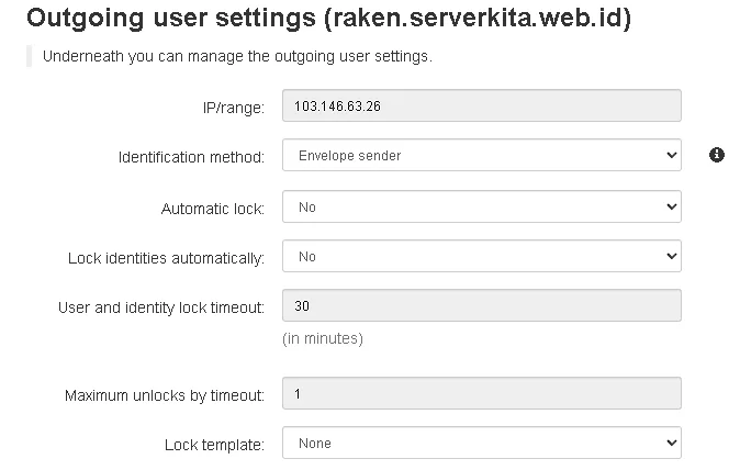 Seperti contoh disini karena saya menggunakan webmail dari cPanel, saya akan menggunakan Authenticating IP dan Authenticating Domain. dengan konfigurasi Authenticating Domain seperti ini :