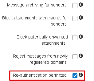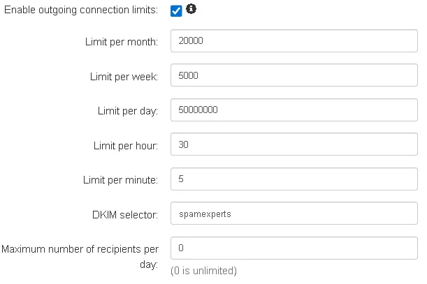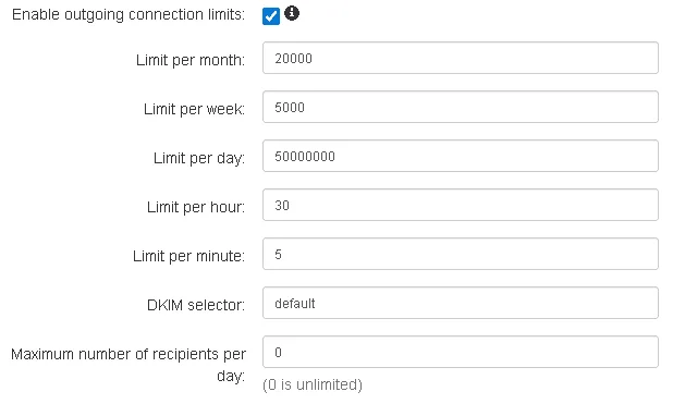 Untuk Limit, kalian bisa sesuaikan limit koneksi ke sistem relay dalam per-jam, per-hari, per-minggu dan per-bulan. masukan DKIM selector yang sudah kita buat sebelumnya di menu DKIM. Lalu checklist Re-authentication permitted.