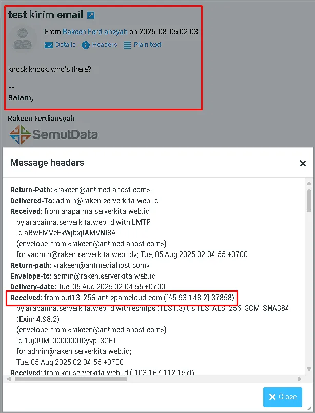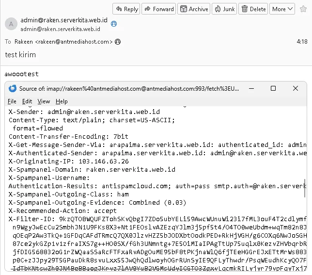 Lalu kita coba test kirim email dari salah satu account email domain yang sudah kita konfigurasi SpamExpert Outbound :