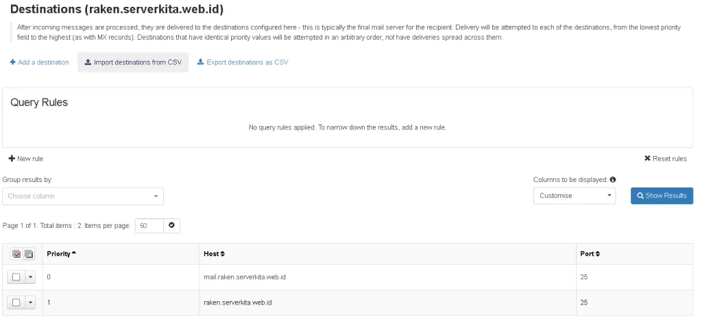 Pastikan juga di panel Spamexperts, menu > Incoming > Destination, mx record mengarah ke server cPanel.