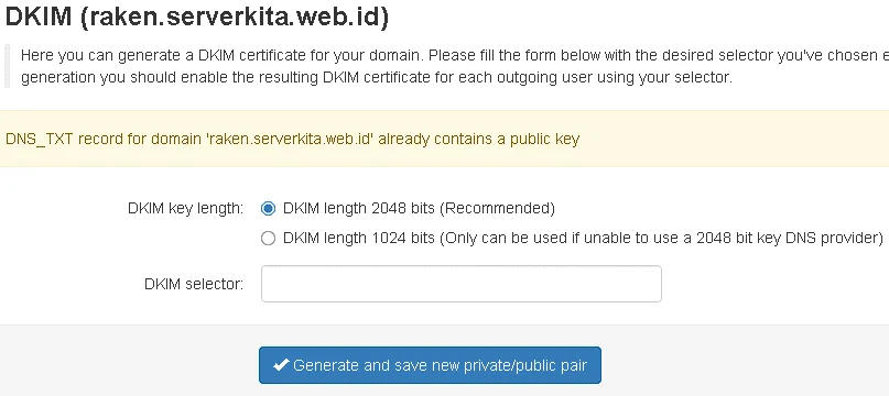 2. Generate DKIM dari panel spamexperts, di menu Outgoing > DKIM. lalu copy hasil generate DKIM dari panel spamexperts ke dns dengan Record "TXT Record"
