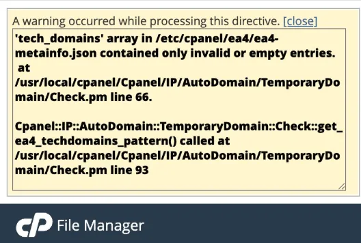 warning/keterangan error tersebut terkait adanya bug pada cPanel dan sesuai rilis informasi dari pihak cPanel terbaru terkait hal ini : https://support.cpanel.net/hc/en-us/articles/33591851185687--tech-domains-array-in-etc-cpanel-ea4-ea4-metainfo-json-contained-only-invalid-or-empty-entries