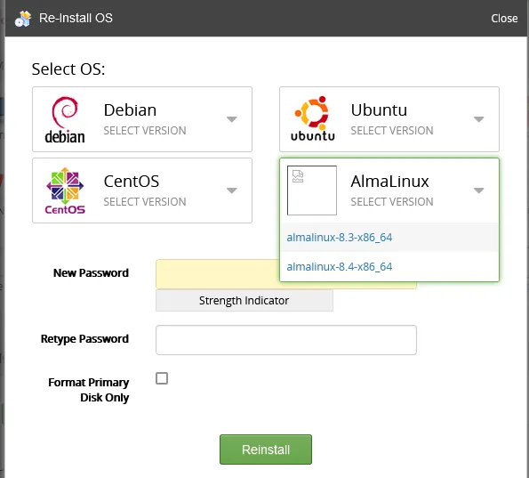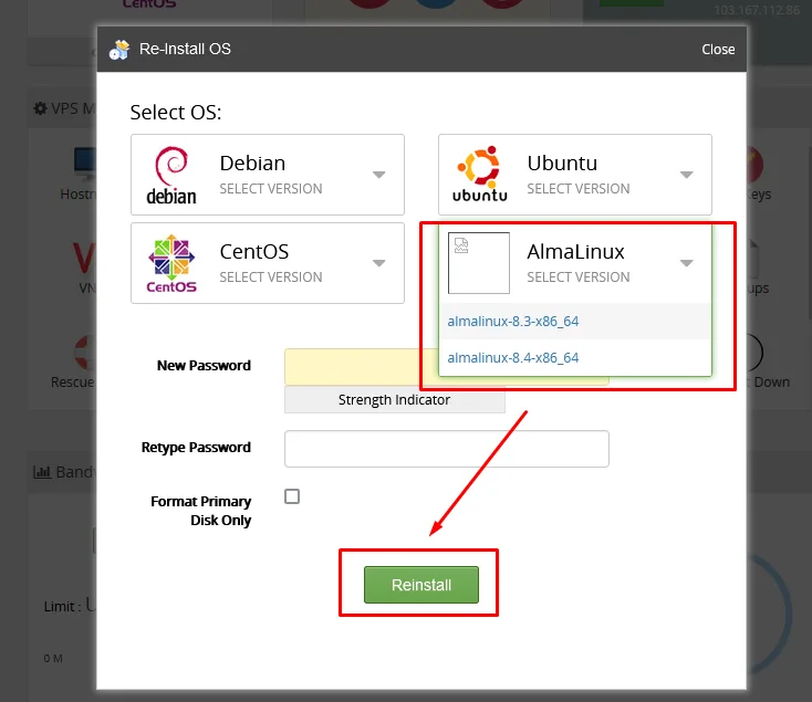 2.kemudian dipilih OS baru yang akan digunakan untuk VPS KVM sobat dan inputkan juga password baru untuk dapat mengakses VPS KVM setelah diproses OS Reinstall :